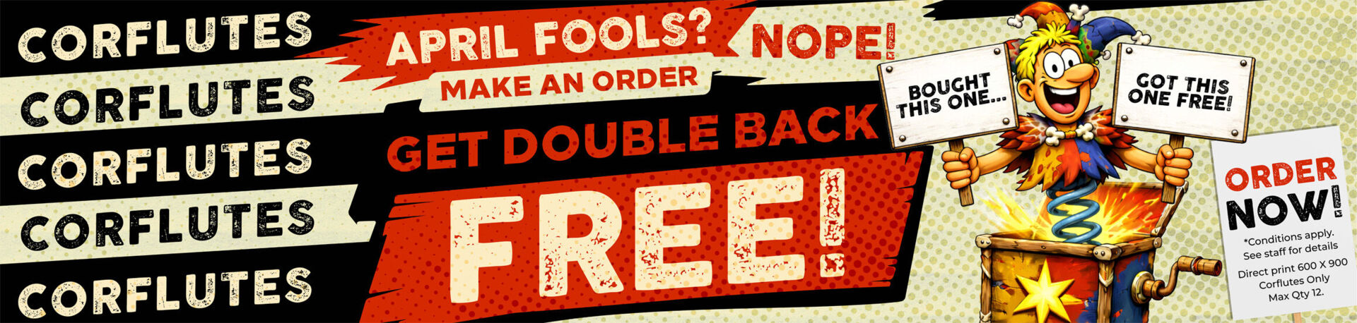 This month, when you order any direct print corflutes, we’ll double your order for free — order and pay for 10, get 20. That's serious value.