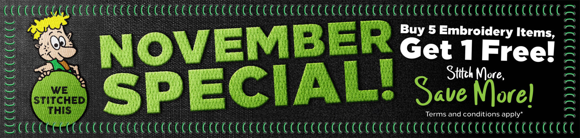 Buy any 5 embroidered items, polos, caps, shorts or uniforms and get the 6th one absolutely FREE.