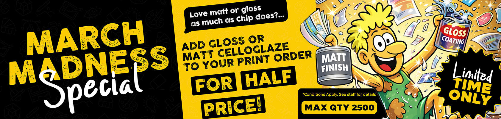 March Madness is here. Add gloss or matt cello glaze to your order for half price.